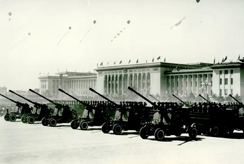 新中國(guó)首批研制生產(chǎn)的100毫米高射炮參加國(guó)慶10周年閱兵