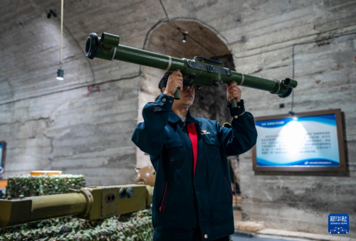 5月16日,一名工作人員在中國光學歷史博物館內(nèi)展示對空測距機使用方法。