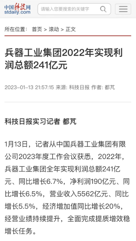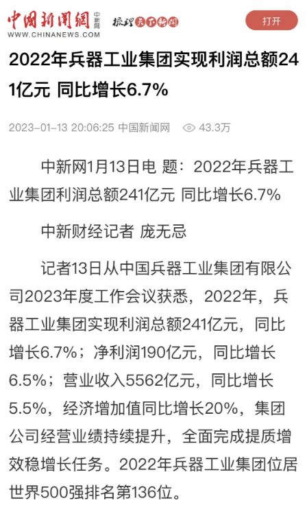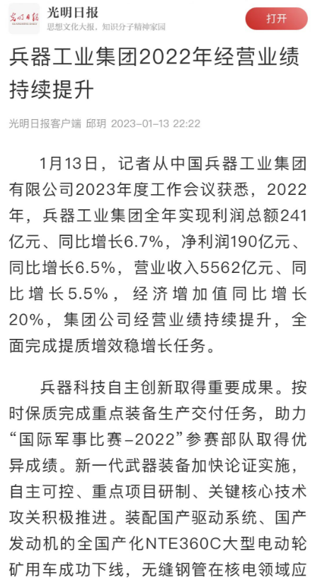 1月13日,中國(guó)兵器工業(yè)集團(tuán)有限公司召開2023年度工作會(huì)議,傳達(dá)學(xué)習(xí)中央領(lǐng)導(dǎo)同志、軍方首長(zhǎng)和上級(jí)部門重要批示,總結(jié)集團(tuán)公司2022年工作,研究部署2023年主要工作任務(wù)。 集團(tuán)公司2022年重點(diǎn)工作取得的成績(jī)及下一步的改革發(fā)展受到社會(huì)媒體廣泛關(guān)注。新華社、新華財(cái)經(jīng)、人民網(wǎng)、經(jīng)濟(jì)日?qǐng)?bào)客戶端、光明日?qǐng)?bào)客戶端、中國(guó)日?qǐng)?bào)網(wǎng)、中國(guó)科技網(wǎng)、中國(guó)新聞網(wǎng)、央廣網(wǎng)、國(guó)資委網(wǎng)站、學(xué)習(xí)強(qiáng)國(guó)中央企業(yè)學(xué)習(xí)平臺(tái)、新浪網(wǎng)、騰訊網(wǎng)、搜狐網(wǎng)、網(wǎng)易網(wǎng)、今日頭條等中央主流媒體、國(guó)家部委網(wǎng)站及知名網(wǎng)絡(luò)媒體對(duì)集團(tuán)公司工作會(huì)議進(jìn)行了報(bào)道,重點(diǎn)關(guān)注集團(tuán)公司高質(zhì)量發(fā)展、科技創(chuàng)新、戰(zhàn)略性新興產(chǎn)業(yè)培育、深化改革、國(guó)際化經(jīng)營(yíng)、履行央企社會(huì)責(zé)任等內(nèi)容。其中新華社以《北斗時(shí)空智能服務(wù)平臺(tái)累計(jì)服務(wù)終端數(shù)突破15億》為題,重點(diǎn)報(bào)道了集團(tuán)公司2022年在自主創(chuàng)新、戰(zhàn)略新興產(chǎn)業(yè)培育、專利申請(qǐng)等方面取得的成績(jī);經(jīng)濟(jì)日?qǐng)?bào)客戶端、光明日?qǐng)?bào)客戶端、中國(guó)日?qǐng)?bào)網(wǎng)等以《兵器工業(yè)集團(tuán)2022年經(jīng)營(yíng)業(yè)績(jī)持續(xù)提升》為題,重點(diǎn)報(bào)道了集團(tuán)公司在高質(zhì)量發(fā)展、全面完成提質(zhì)增效穩(wěn)增長(zhǎng)方面取得的成績(jī)。集團(tuán)公司門戶網(wǎng)站、微信公眾號(hào)、微博等新媒體也對(duì)集團(tuán)公司工作會(huì)議進(jìn)行了及時(shí)報(bào)道,各成員單位紛紛對(duì)相關(guān)內(nèi)容進(jìn)行轉(zhuǎn)載,引發(fā)全系統(tǒng)關(guān)注。 新華社:北斗時(shí)空智能服務(wù)平臺(tái)累計(jì)服務(wù)終端數(shù)突破15億 新華財(cái)經(jīng):兵器工業(yè)集團(tuán)2022年實(shí)現(xiàn)凈利潤(rùn)190億元 同比增長(zhǎng)6.5% 人民網(wǎng):2022年中央企業(yè)營(yíng)收同比增長(zhǎng)8.3% 科技創(chuàng)新成效顯著 經(jīng)濟(jì)日?qǐng)?bào)客戶端:兵器工業(yè)集團(tuán)2022年經(jīng)營(yíng)業(yè)績(jī)持續(xù)提升 光明日?qǐng)?bào)客戶端:兵器工業(yè)集團(tuán)2022年經(jīng)營(yíng)業(yè)績(jī)持續(xù)提升 中國(guó)日?qǐng)?bào)網(wǎng):兵器工業(yè)集團(tuán)2022年經(jīng)營(yíng)業(yè)績(jī)持續(xù)提升 中國(guó)科技網(wǎng):兵器工業(yè)集團(tuán)2022年實(shí)現(xiàn)利潤(rùn)總額241億元 中國(guó)新聞網(wǎng):2022年兵器工業(yè)集團(tuán)實(shí)現(xiàn)利潤(rùn)總額241億元 同比增長(zhǎng)6.7% 國(guó)資委網(wǎng)站:2022年兵器工業(yè)集團(tuán)實(shí)現(xiàn)利潤(rùn)總額241億元 同比增長(zhǎng)6.7% 學(xué)習(xí)強(qiáng)國(guó)中央企業(yè)學(xué)習(xí)平臺(tái):兵器工業(yè)集團(tuán)2022年經(jīng)營(yíng)業(yè)績(jī)持續(xù)提升 集團(tuán)公司職工及廣大網(wǎng)友熱議工作會(huì)議 “這次會(huì)議全面總結(jié)了2022年工作,深入分析研判當(dāng)前形勢(shì),部署2023年重點(diǎn)工作,為我們做好2023年及今后一個(gè)時(shí)期的工作明確了目標(biāo)、堅(jiān)定了信心。” “作為兵工人,我要苦練內(nèi)功、不懼挑戰(zhàn)、奮勇向前,為建設(shè)具有全球競(jìng)爭(zhēng)力的世界一流集團(tuán)公司貢獻(xiàn)自己的力量?!?/p> “聚焦高科技領(lǐng)域,制造更多的大國(guó)重器,讓更多的產(chǎn)品服務(wù)老百姓?!?/p> “在不平凡的2022年取得了亮眼的工作成績(jī),為兵器工業(yè)點(diǎn)贊?!?/p> “希望能有更多新型武器裝備部隊(duì),2023年,望你們?cè)賱?chuàng)輝煌,加油!” |